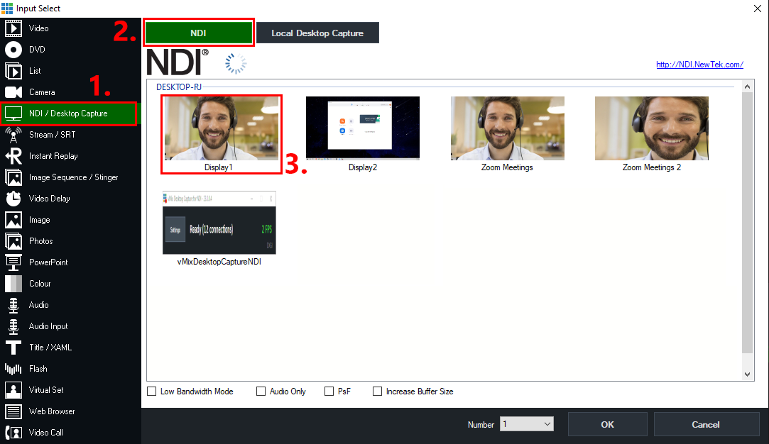 Once your guests have joined your Zoom meeting, we can now add them into vMix. Go back to your main vMix PC. Select the Add Input button from the bottom left corner. Then select the NDI / Desktop Capture tab. Choose the NDI button from the top. From here, we need to select the corresponding display number that you have Zoom currently displaying on. This will likely be Display1. Select the Display1 option and press OK.