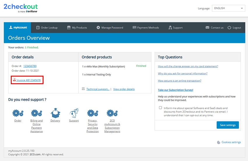 All vMix software sales and subscriptions are handled by our payment provider - 2Checkout. In order to manage your orders including viewing and downloading invoices, please login to your 2Checkout account portal.