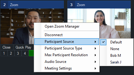 If you have chosen to add a new Zoom input via the Add Input menu, then by default it will still show the first Zoom participant that joined. In order to change this to show a different participant, right click the Zoom Input, navigate to the Participant Source option and then select the participant you wish to assign to this Zoom input.