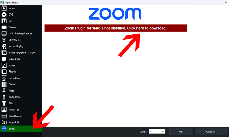 If using the Zoom input in vMix for the first time, you will be prompted to install the Zoom plugin for vMix. In vMix go to Add Input, select the Zoom tab, then select the banner to go to the download link.